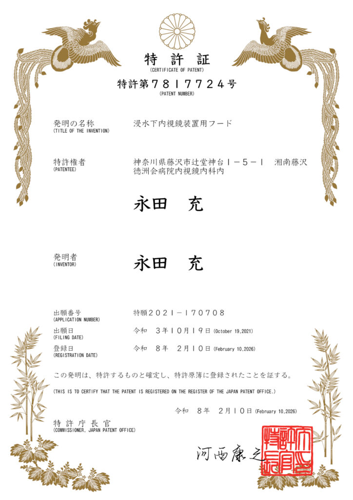 この課題を解決するため、2020年に「浸水下内視鏡装置用フード」に関する特許を出願し、