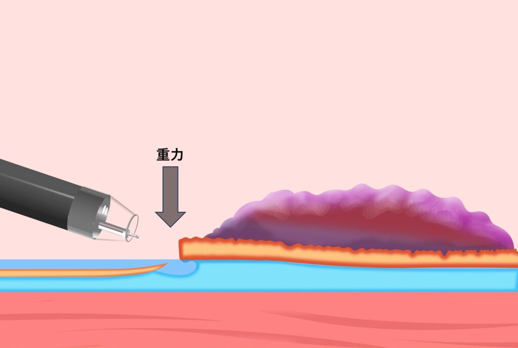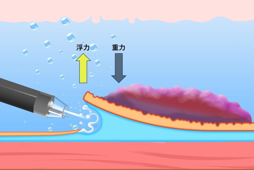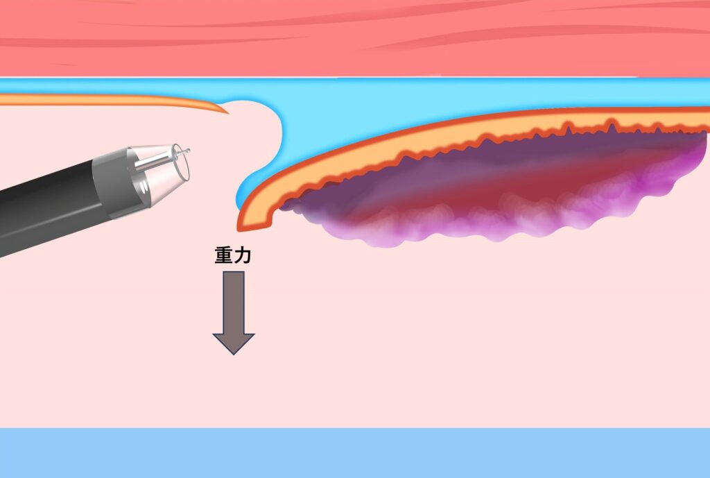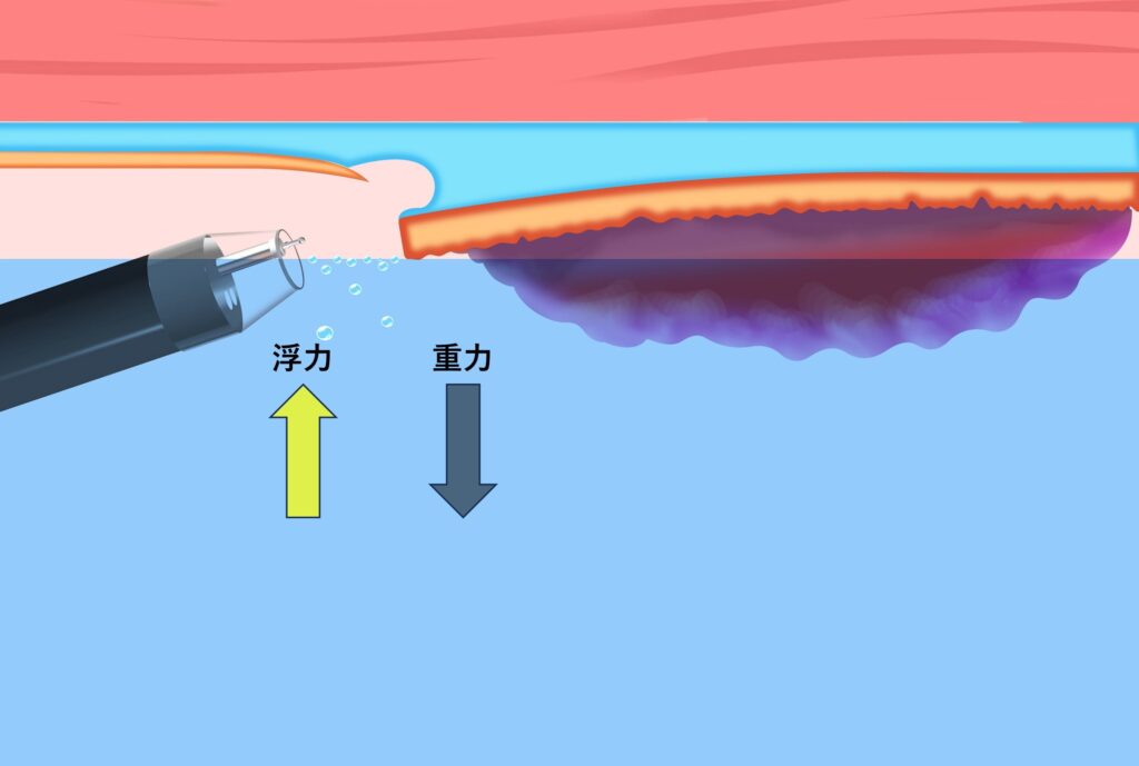 浸水下では、病変には浮力が作用します。浮力は重力と逆方向に作用するため、病変が重力側に位置する場合、粘膜フラップの展開を補助する方向に働きます(図2)。